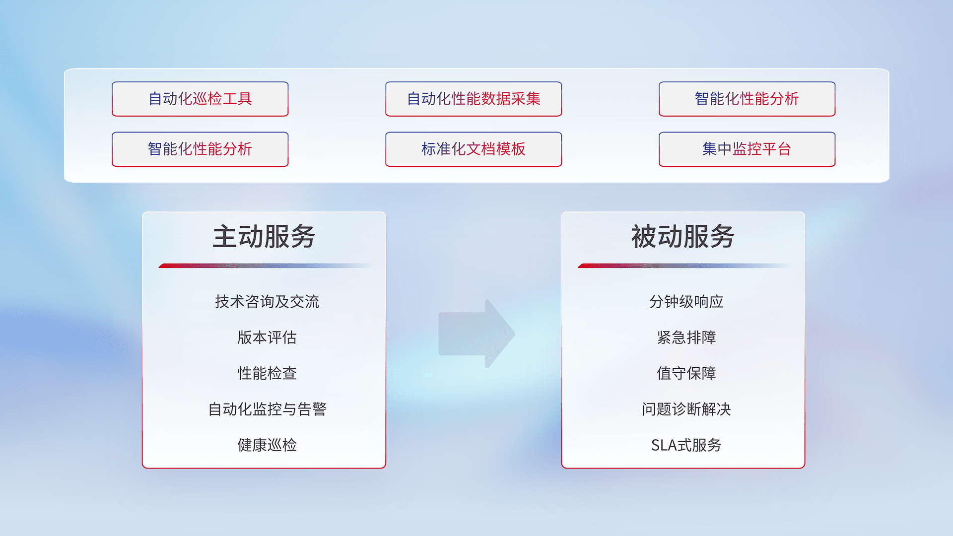智能化工具和标准化文档,,保障服务质量,,,,提供主动服务(包含技术咨询、、、版本评估、、性能检查、、、、自动化监控与告警、、、、健康巡检)和被动服务包含(分钟级响应、、、紧急排障、、值守保障、、、问题诊断解决、、、、SLA服务)。。