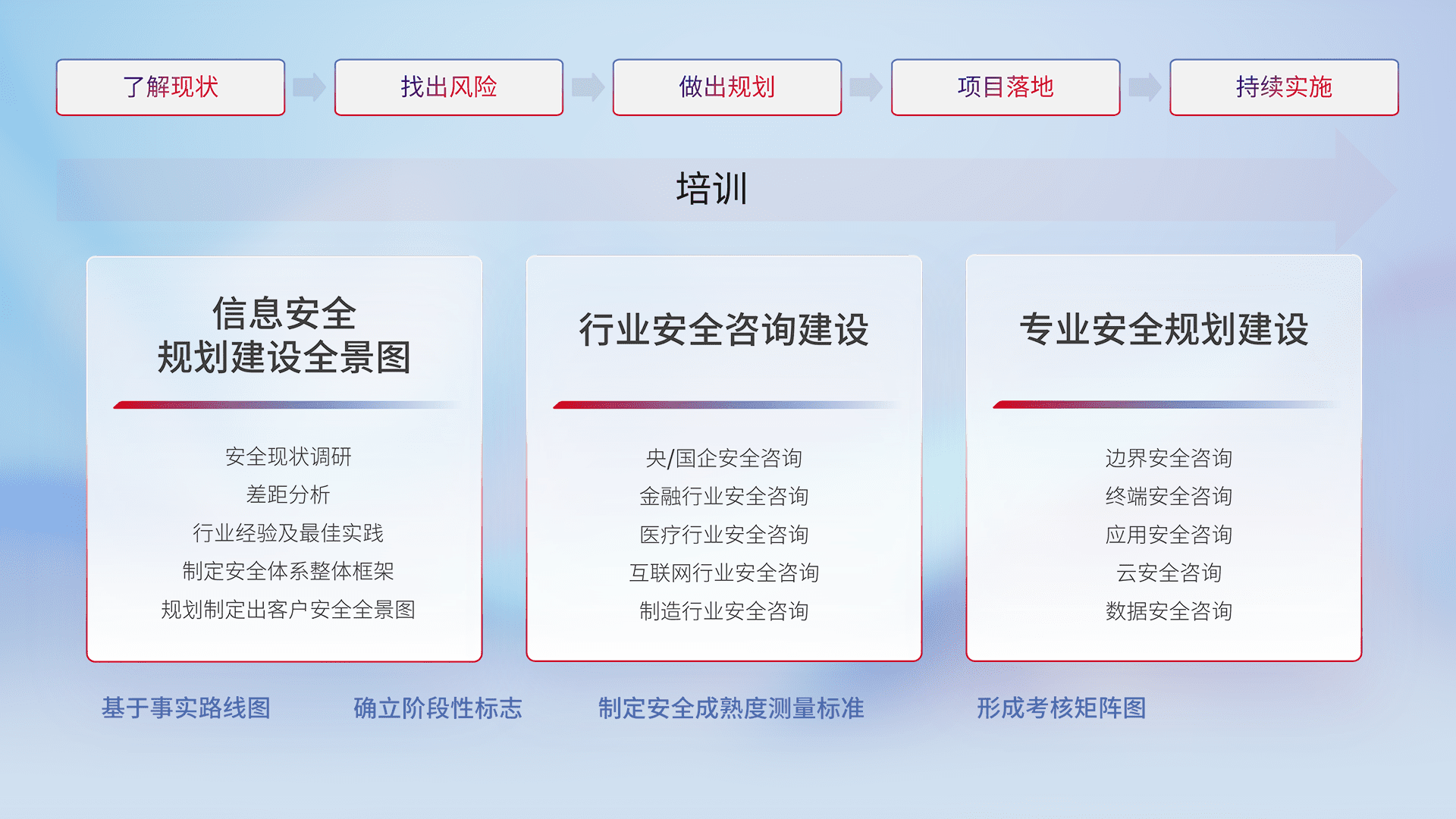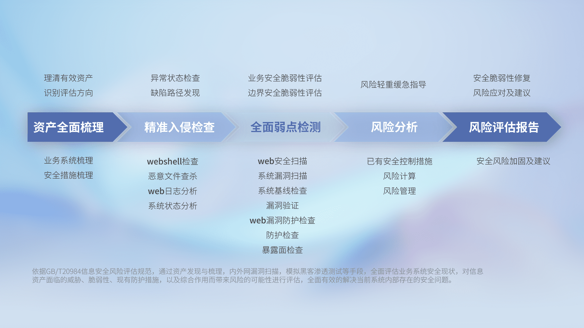 针对客户行业特性,,,,以专业的安全服务+多厂商联合解决方案提供专属的一站式安全管理服务,,,帮助客户全面感知网络空间威胁,,,,基于识别、、、、检测、、、分析、、、防护、、、、监测、、响应的服务理论模型,,,,从方案咨询、、集成交付、、评估验证、、优化加固、、、运维运营,,致力于为客户提供完整的闭环管理式安全服务。。。。以实战经验为客户打造高抵御风险的安全体系,,,帮助客户发现威胁、、、对抗威胁、、、、处置威胁,,,,不断积累安全对抗能力,,,,持续保障数字化安全。。。。