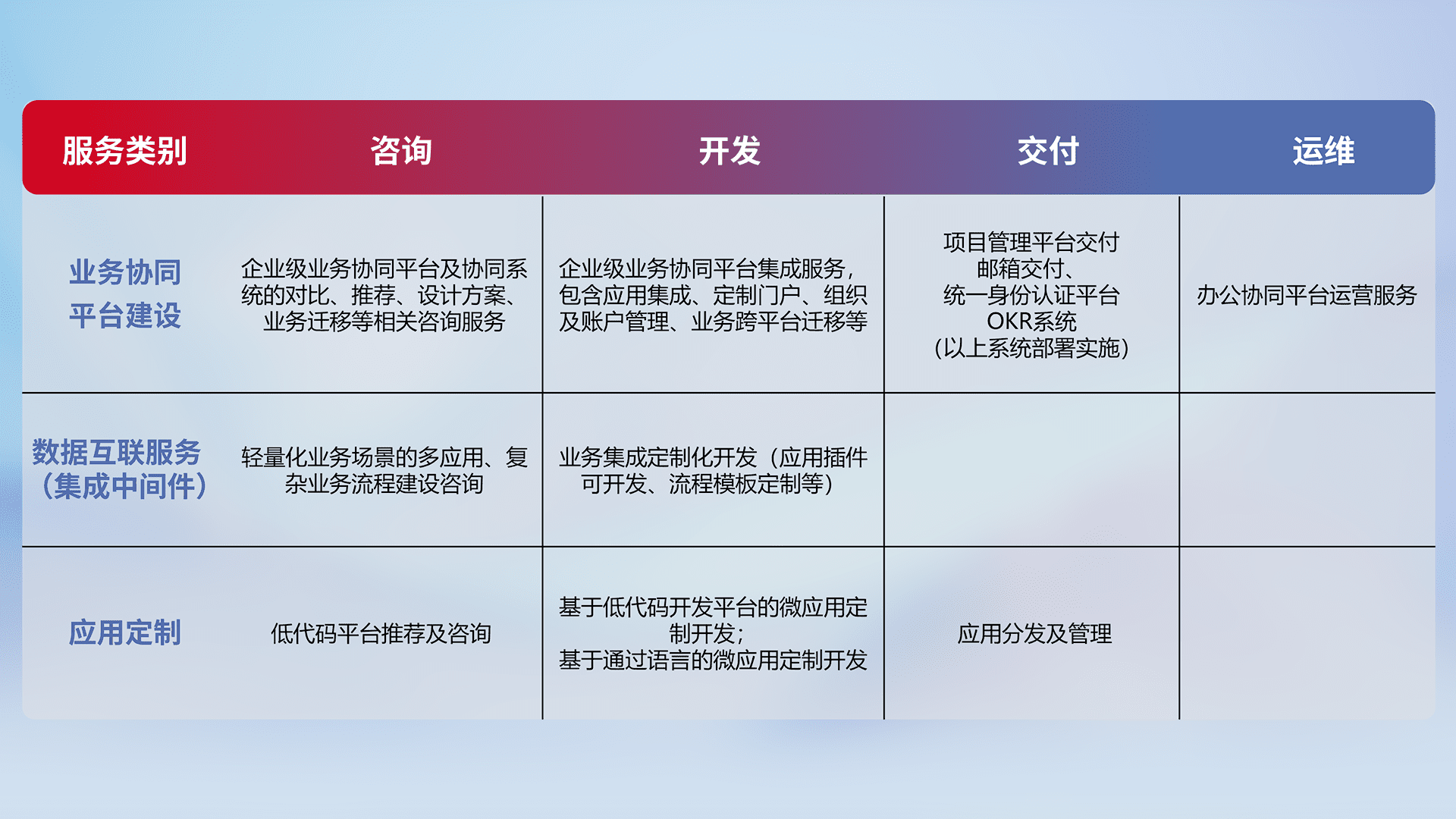 针对钉钉、、、、企微、、、、IDaas等平台级产品提供产品的规划、、、、方案、、、交付、、定制化开发等服务,,实现如统一协同办公、、、智能客户服务、、、、混合会议管理、、智能数据查询、、、等业务场景,,,,实现数字化转型。。。